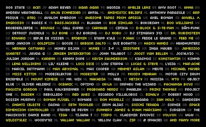 808 State (UK), ACE1 (JP), Adam Beyer (SE), Agar Agar (FR), Agoria (FR), Amelie Lens (BE), Amy Root (NL), Anna (BR), Andrew Weatherall (UK), Anja Schneider (DE), Antal (NL), Animistic Beliefs (NL), Anthony Parasole (US), Arp Frique (NL), ATEQ (DE), Avalon Emerson (US), Awesome Tapes From Africa (US), Axel Boman (SE), Axwell / Ingrosso (SE), Baris K (TR), Bassjackers (NL), Blawan (UK), Bob Sinclar (FR), Bokoesam (NL), Boo Williams (US), Broederliefde (NL), Bruxas (NL), Call Super (UK), Carnage (US), CIFIKA (KR), D-Block & S-Te-Fan (NL), DĂąm-Funk (US), Detroit Swindle (NL), DJ Bone (US), Dj Boring (AU), DJ Nobu (JP), DJ Stingray 313 (US), Dr. Rubinstein (DE), Edward (DE), Eefje de Visser (NL), Efdemin (DE), Etapp Kyle (UA) FJAAK (DE), Fedde Le Grand (NL), Feed Me (UK), Gerd Janson (DE), GoldFish (ZA), GOOSE (BE), Gregor Salto (NL), Gui Boratto (BR), Haiku Hands (AU), Headhunterz (NL), Hernan Cattaneo (AR), Honey Dijon (US), Hunee (DE), I-F (NL), Idiotape (KR), Inga Mauer (RU), Jameszoo Quartet (NL), Jayda G (CA), Jensen Interceptor (AU), John Talabot (ES), Joost van Bellen (NL), Josylvio (NL), Julian Jordan (NL), Karenn (UK), Kenny Dope (US), Kevin Saunderson (US), Kiasmos (IS), Konstantin (DE), KSHMR (US), Lena Willikens (DE), Lilâ Kleine (NL), Loco Dice (DE), Low Steppa (UK), Lucas & Steve (NL), Lyzza (NL), Map.ache (DE), Marcel Dettmann (DE), Max Abysmal (NL), Max Cooper (UK), Mehmet Aslan (CH), MEUTE (DE), Michael Mayer (DE), Miss Kittin (FR), Modeselektor (DE), Modestep (UK), Molly (FR), Moody Mehran (NL), Motor City Drum Ensemble (DE), Mount Kimbie (UK), Mr. Wix (NL), Nakadia (TH), Neel (IT), Netsky (BE), Noisia (NL), N’to (FR), OBJECT BLUE (CN), Oliver Heldens (NL), Oceanic (NL), Optimo (UK), Or:la (UK), Orpheu The Wizard (NL), Pachanga Boys (MX), Paquita Gordon (IT), Paul Kalkbrenner (DE), Pegboard Nerds (NO), Phaeleh (KR), Prins Thomas (NO), Project One (NL), Raiden (KR), Rebolledo (MX), Red Axes (IL), Ricardo Villalobos (CL), Rinaly (JP), Robert Hood (US), Roisin Murphy (UK), Roman FlĂŒgel (DE), Romare (UK), Ron Morelli (US), Saagara (IN), San Holo (NL), Sandrien (NL), Shanti Celeste (CL), Sasha (UK), Seth Troxler (US), Sevn Alias (NL), Soichi Terada (JP), SOPHIE (UK), Space Dimension Controller (UK), Steven de Peven (BE), Sunnery James & Ryan Marciano (NL), Surgeon (UK), The Mauskovic Dance Band (NL), Tiga (CA), Tijana T (RS), Tsepo (NL), Vladimir Ivkovic (DE), Volvox (US), W&W (NL), Wildstylez (NL), Woody’92 (NL), Yallah! Yallah! (NL), Yellow Claw (NL) & Zip (DE).