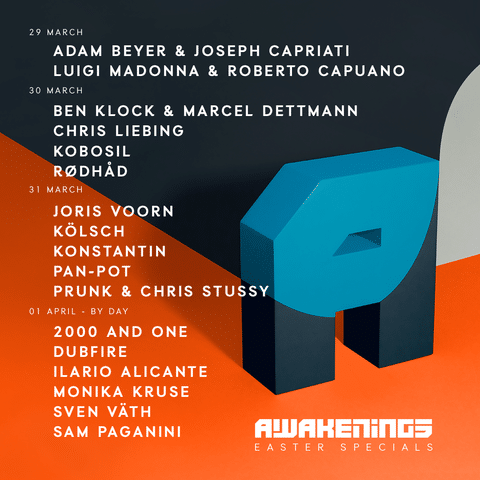 This coming year Awakenings will celebrate Easter with four editions of its iconic events from March 29 to April 1, including the special daytime show on Easter Sunday April 1. The venue, as always, will be at the Gashouder on the Westergasfabriek in Amsterdam.