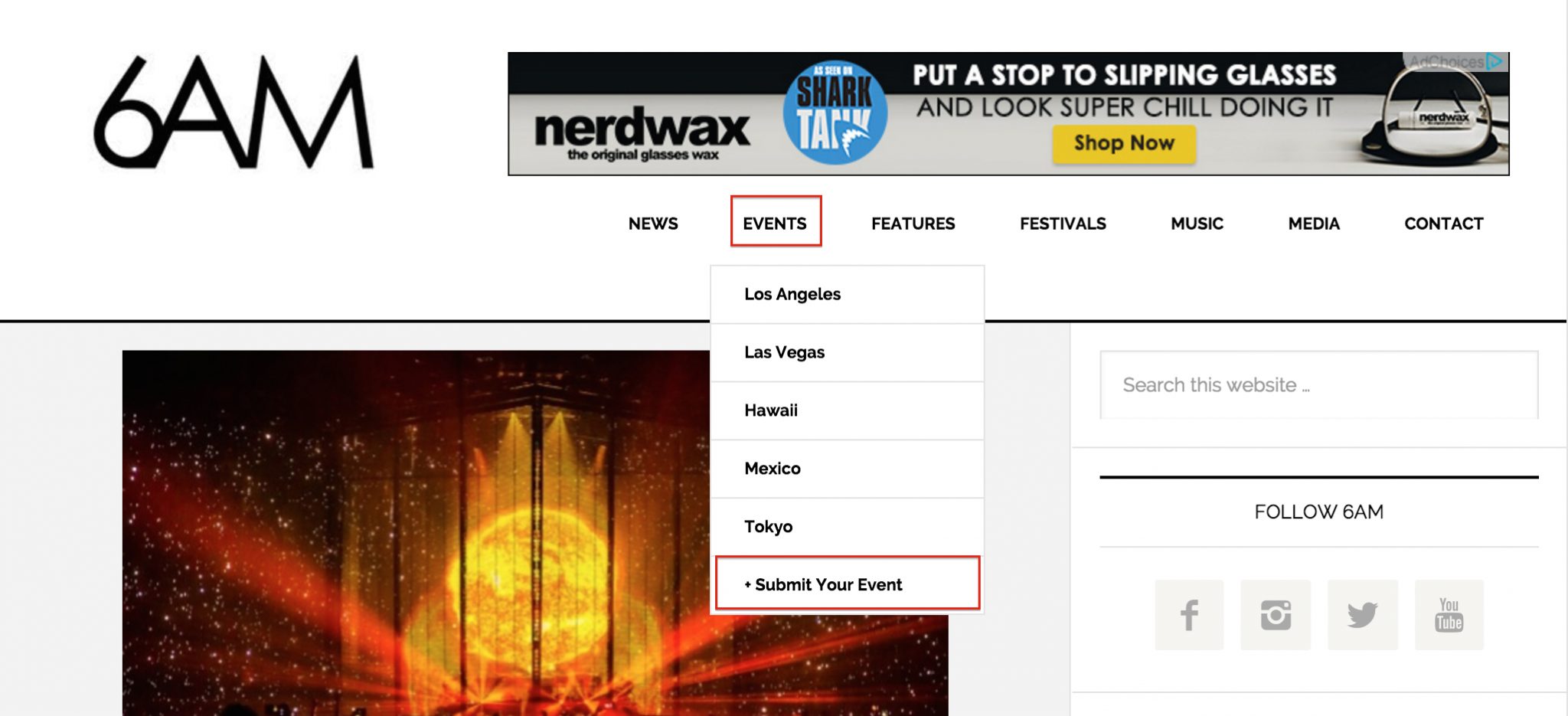 1. From the 6AM Group homepage – go to the navigator bar and hover over the “events” tab (Screenshot below)
