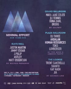 Los Angeles based Minimal Effort has now announced the full lineup and stage breakdown for its upcoming New Year’s Eve edition at The MacArthur.