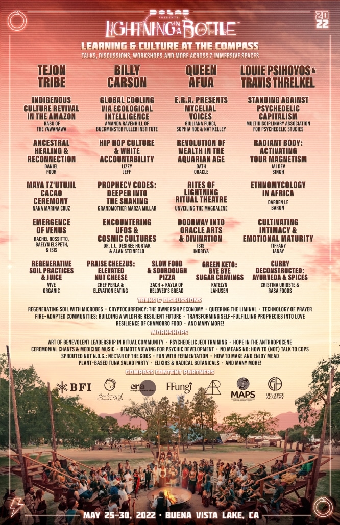 Lightning in a Bottleâs Compass environments host an array of learning and culture programming that aligns with the core principles of the festival – creating space for connection, expression, and community. Highlighted talks and discussions among this yearâs programming include Regenerating Soil with Microbes, Cryptocurrency: The Ownership Economy, Queering the Liminal, Technology of Prayer, Fire Adapted Communities: Building A Wildfire Resilient Future, Transforming Fulfilling Prophecies into Love, Resilience of Chamorro Food and more.