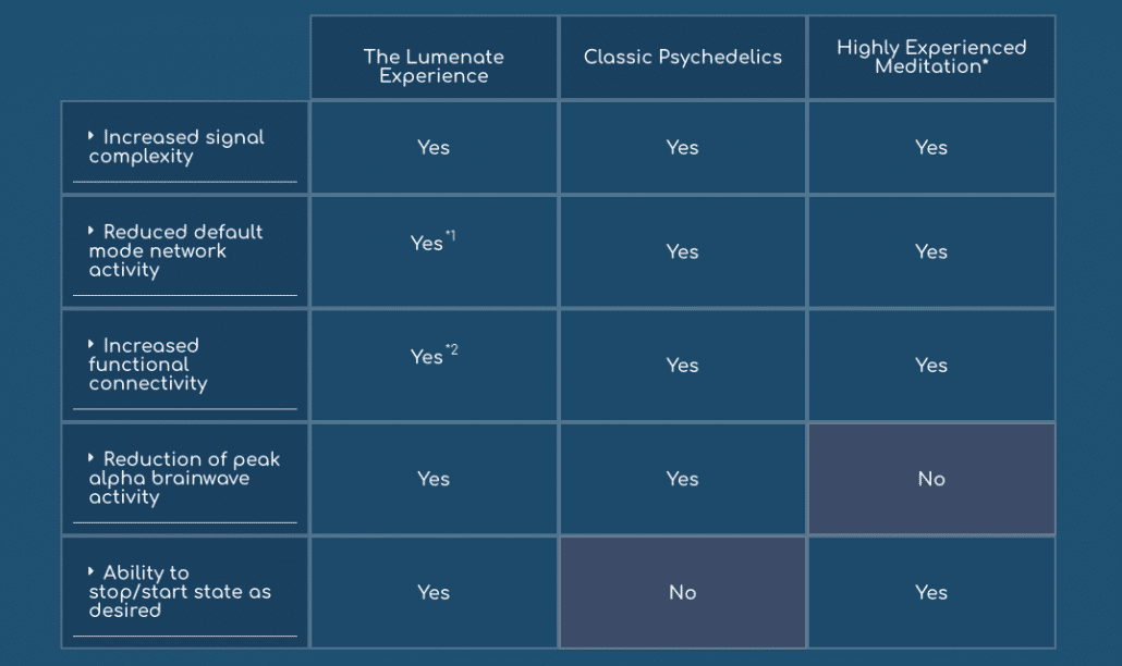 Lumenate began by reviewing hundreds of scientific papers covering subconscious exploration states such as deep meditation, dreaming, hypnagogia, sensory deprivation, psychedelics, shamanic trances and dance induced altered states. They then joined-the-dots and came up with their own ‘design brief’ for the perfect brain state for subconscious exploration.